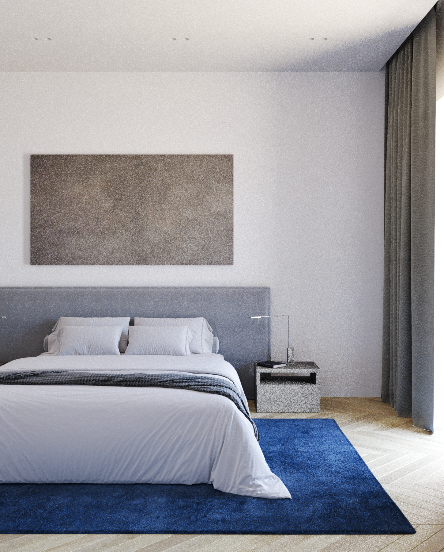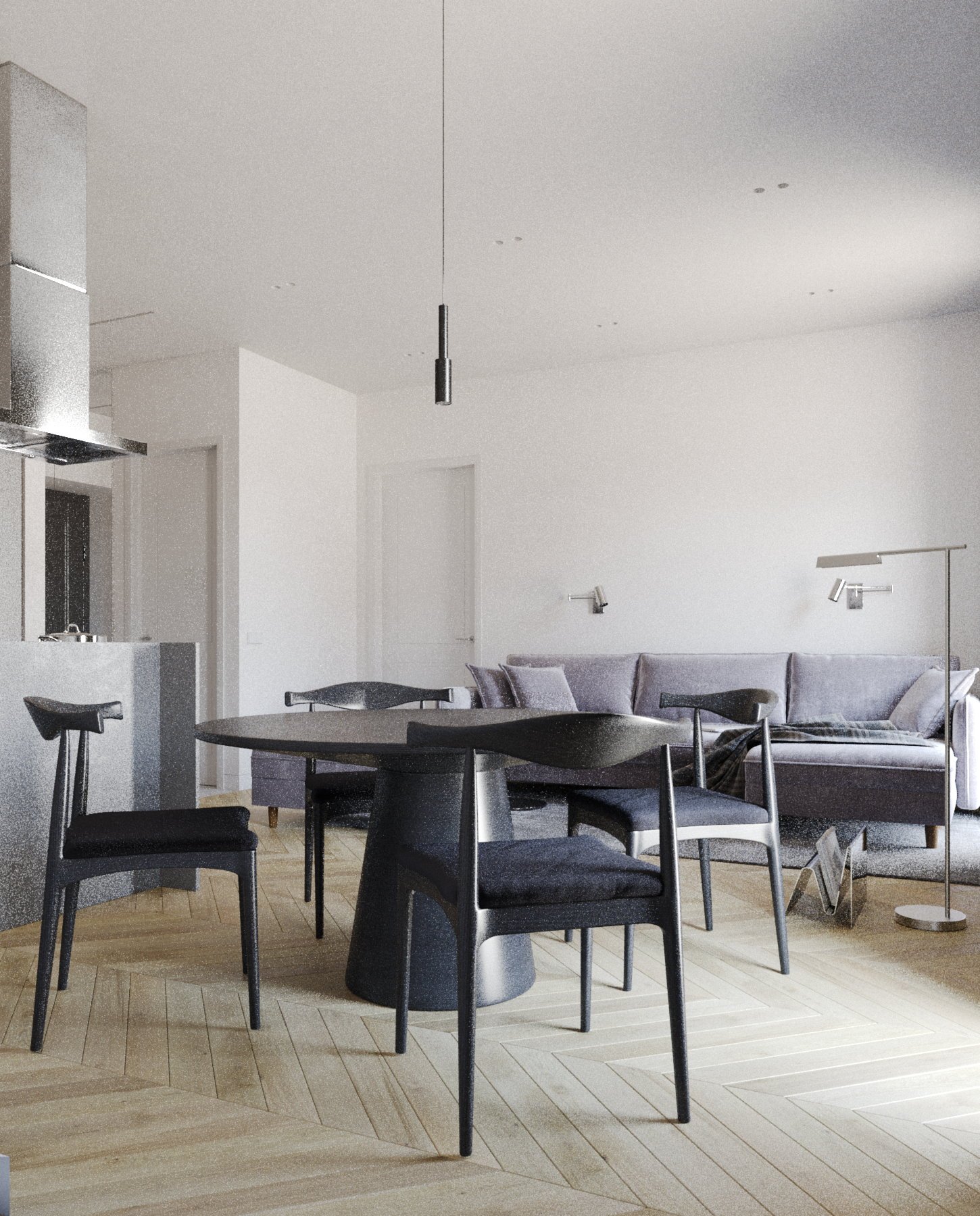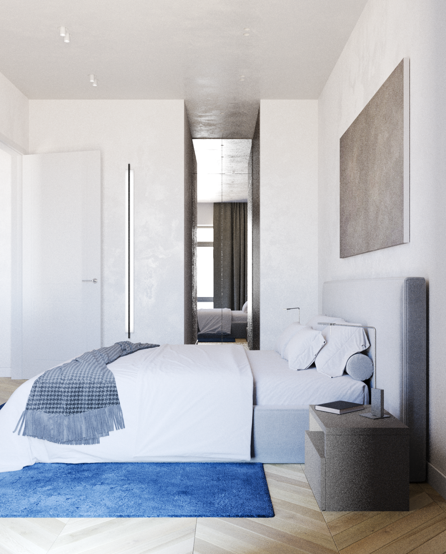 Пространство студии поделено на основные функциональные зоны - прихожей, кухни, столовой и гостиной, плавно переходящих друг в друга, а также закрытые зоны спальни, ванной комнаты и гардеробной. Столовую зону возможно также использовать в качестве рабочей. Спальня в данном проекте является исключительно зоной отдыха, поэтому в ней располагается минимальное количество мебели; есть своя гардеробная зона. Основная система освещения - группы точечных встраиваемых светильников, которые могут варьироваться с люстрой или торшером. В прихожей в качестве источника освещения используется шинопровод с трековыми светильниками.