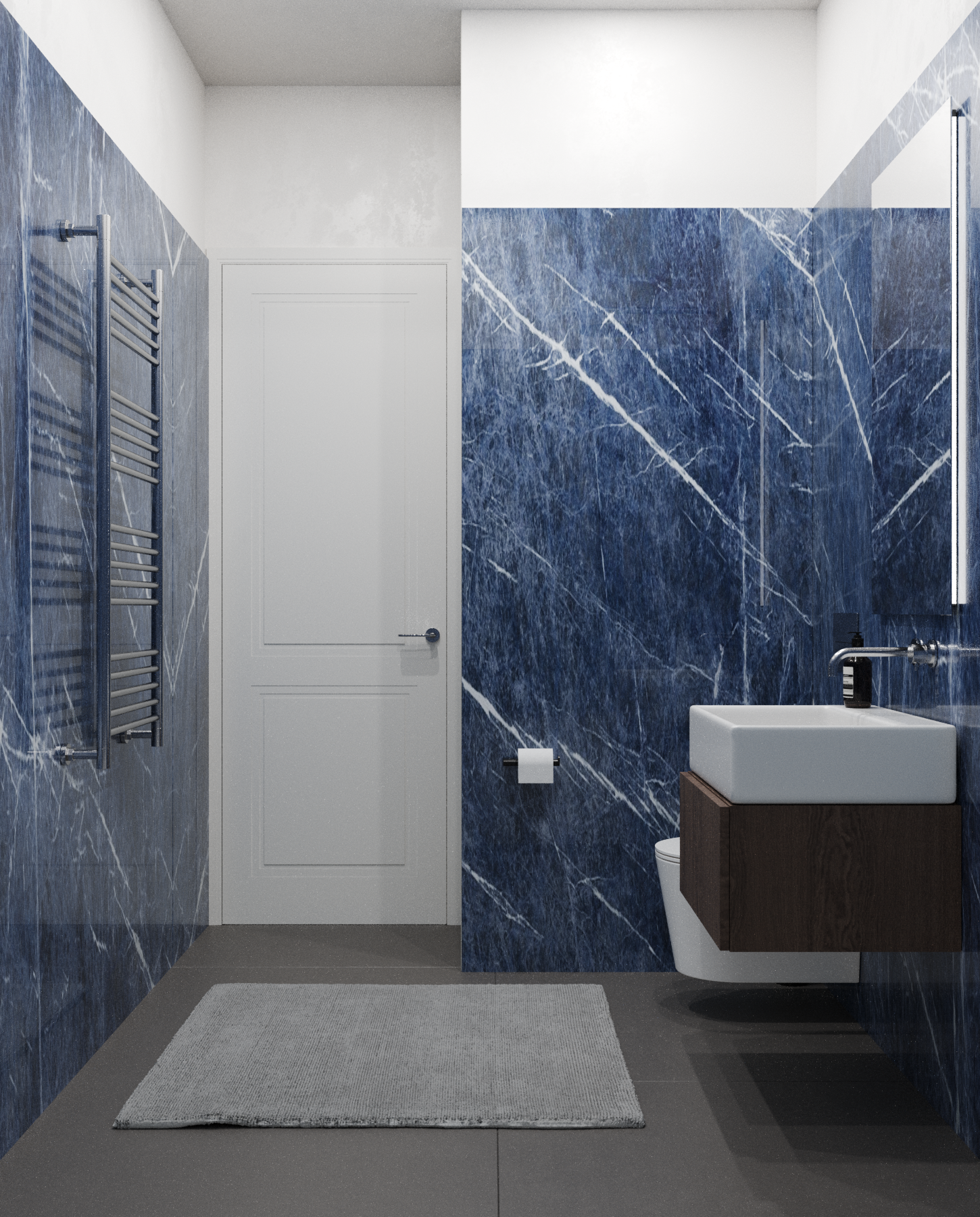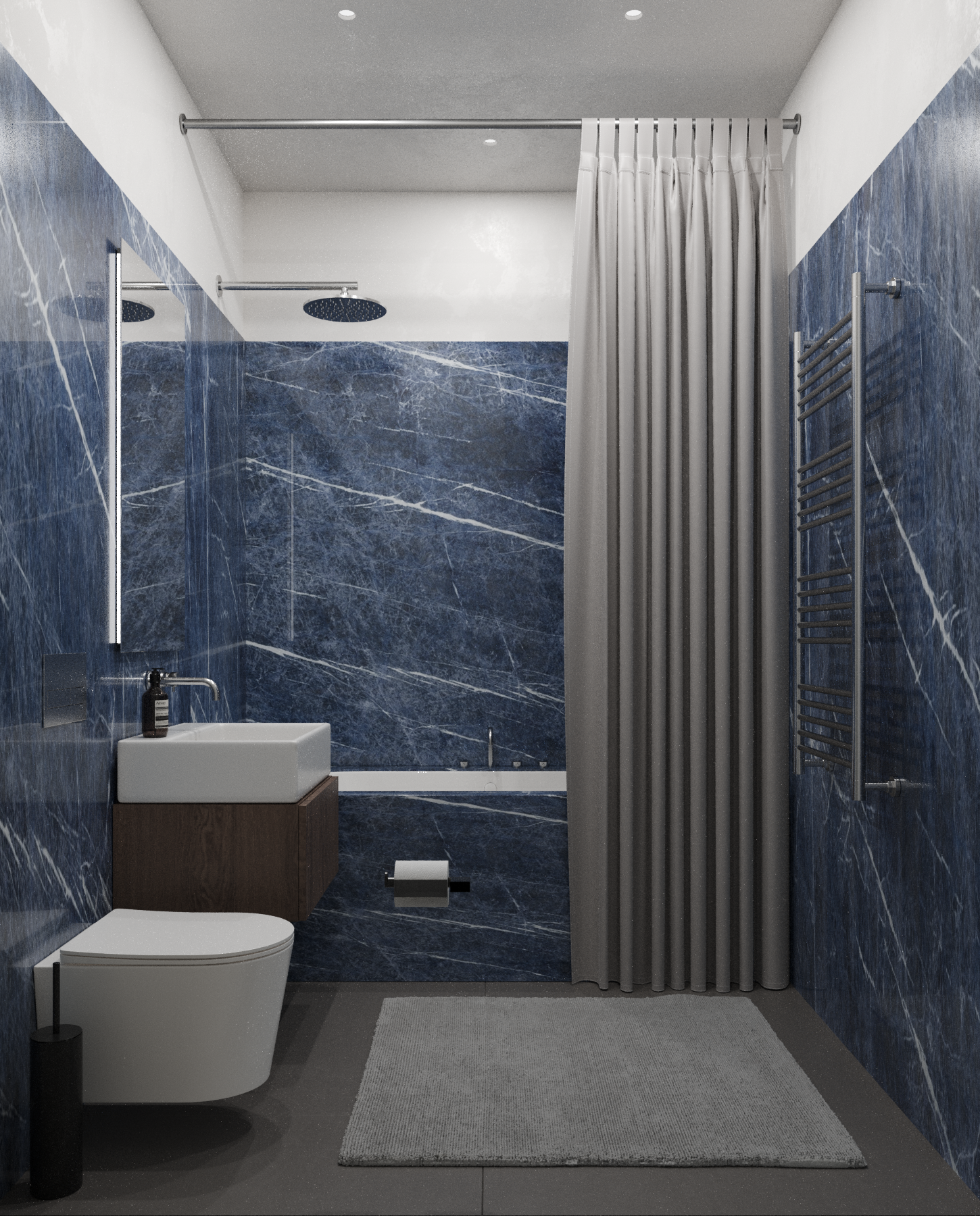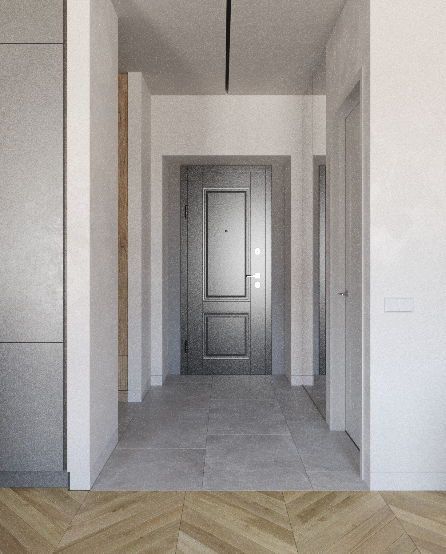 Пространство студии поделено на основные функциональные зоны - прихожей, кухни, столовой и гостиной, плавно переходящих друг в друга, а также закрытые зоны спальни, ванной комнаты и гардеробной. Столовую зону возможно также использовать в качестве рабочей. Спальня в данном проекте является исключительно зоной отдыха, поэтому в ней располагается минимальное количество мебели; есть своя гардеробная зона. Основная система освещения - группы точечных встраиваемых светильников, которые могут варьироваться с люстрой или торшером. В прихожей в качестве источника освещения используется шинопровод с трековыми светильниками.